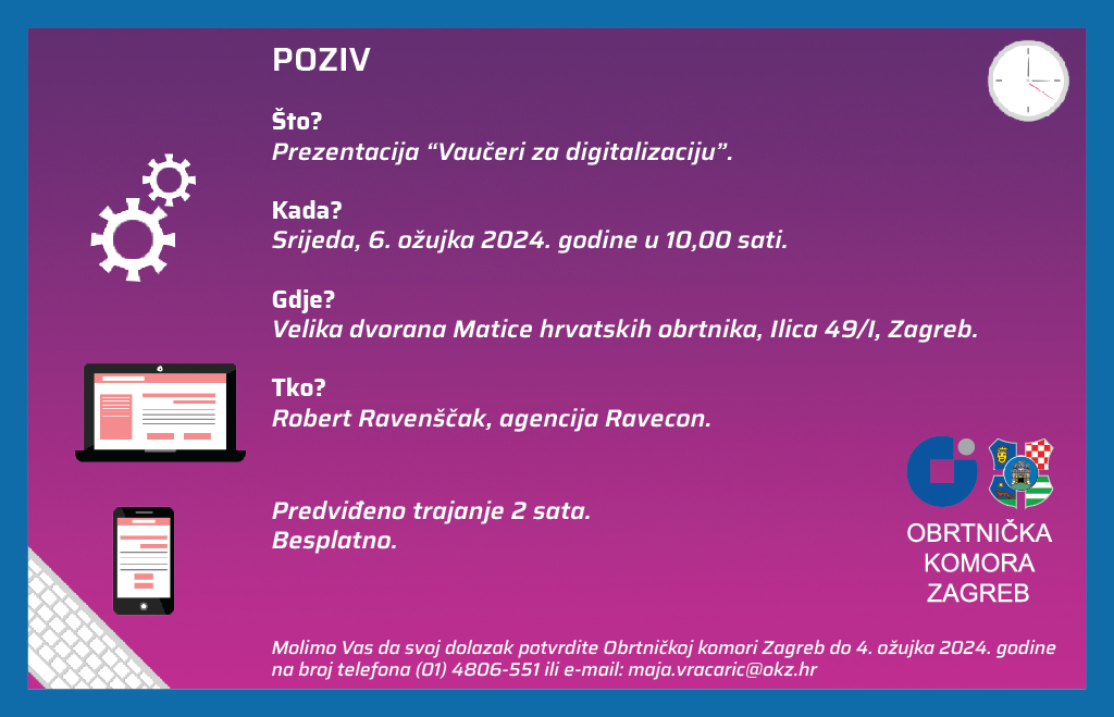 Kako bi Vam pomogli da pronađete odgovore na sva pitanja u vezi natječaja “Vaučeri za digitalizaciju” te da se prijavite i unaprijedite svoje poslovanje, Obrtnička komora Zagreb organizira prezentaciju s predavačem koji se bavi EU fondovima da pojasni sve što Vas zanima vezano za ovaj natječaj.